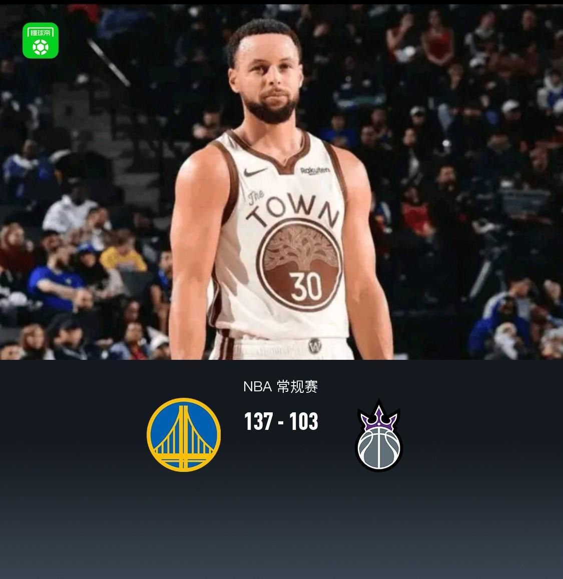 第四节,开节短暂拉锯之后国王再度断电,勇士波杰姆斯基、桑托斯、格林领衔一波23-8直接领先接连30分,后半节双方逐渐撤下主力进入练兵时间,勇士继续拉大分差至30分以上,全场结束,勇士137-103大胜国王。